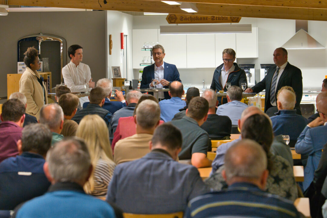 Zuerst stand die eidgenössische Volksinitiative «Für eine soziale Klimapolitik – steuerlich gerecht finanziert», kurz Initiative für eine Zukunft im Zentrum. Dieses JUSO-Begehren verlangt eine 50%-Steuer auf Nachlässen über 50 Millionen Franken zur Finanzierung des Klimaschutzes. Nationalrat Martin Hübscher (SVP) geisselte das Ansinnen als Frontalangriff auf Leistungsträger, Familienbetriebe und Arbeitsplätze. Er warnte vor dem Wegzug von Investoren und rief dazu auf, diese Gefahr für den Wohlstand abzuwehren. Er erinnerte das Publikum daran, dass 1% der Steuerzahlenden 40% der Steuereinnahmen ausmachen. «Der besten Kuh im Stall muss man Sorge tragen. Denn sie findet auch auf einer anderen Weide genügend Gras». Kantonsrätin Mandy Abou Shoak (SP) sieht keine Gefahr, dass Unternehmen ins Ausland abwandern. Auf die Frage, wie Abou Shoak es rechtfertige, dass 2’500 Personen das gesamte Klima retten sollen, entgegnete sie, dass diese wohlhabenden Personen auch den meisten Schaden am Klima beifügen. Für Martin Hübscher ist klar, die Initiative basiert auf vielen Unklarheiten. Unklar ist, wie der Verteilschlüssel aussieht und zu welchem Zweck die zusätzlich generierten Steuereinnahmen eingesetzt werden können.