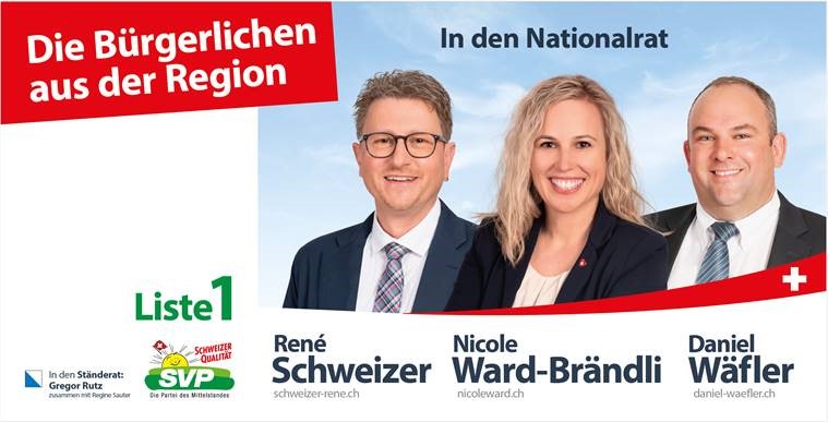 Mit dem Trio, welches von SVP-Bezirkspräsident und Unternehmer René Schweizer aus Fischenthal angeführt wird, stehen die Chancen auf eine bisher fehlende bürgerliche Vertretung, des sehr bürgerlichen Bezirkes mittelfristig sehr gut. Wie bereits vor vier Jahren kandidiert, die aus Hinwil kommende, Nicole Ward-Brändli, erneut für den Nationalrat und will ihr grosses Wissen als Gemeindeschreiberin und Ersatz-Bezirksrätin in die nationale Politik einbringen. Neu kandidiert Kantonsrat Daniel Wäfler aus Gossau. Als erfahrener Parlamentarier und derzeitiger Präsident der Kommission für Justiz und öffentliche Sicherheit des Kantons Zürich, will er auch nationale Sicherheitspolitik betreiben und die Interessen der Bevölkerung in Bern vertreten.